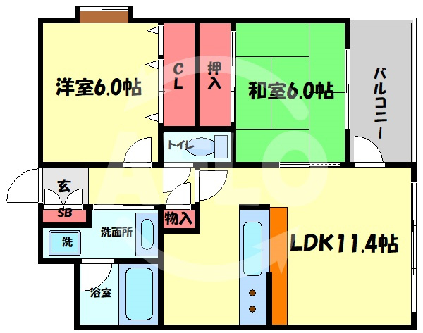 LDK 11.4帖/洋室 6.0帖/和室 6.0帖 - 向き