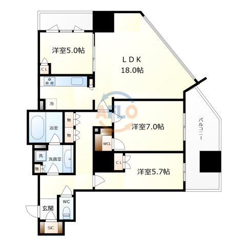LDK 19.0帖/洋室 7.0帖/洋室 5.7帖/洋室 5.0帖 - 向き